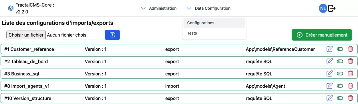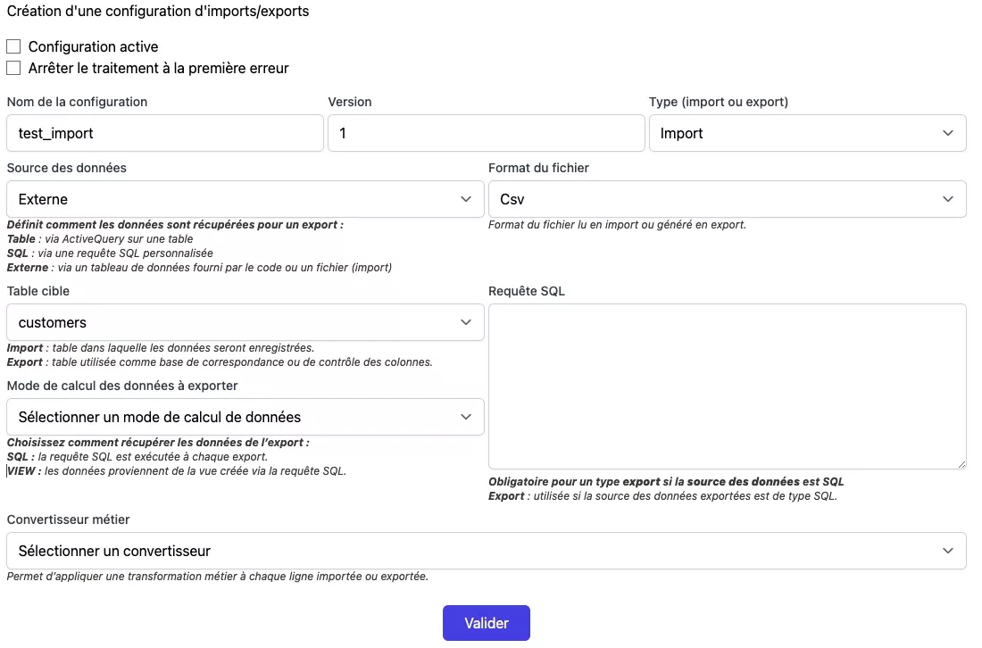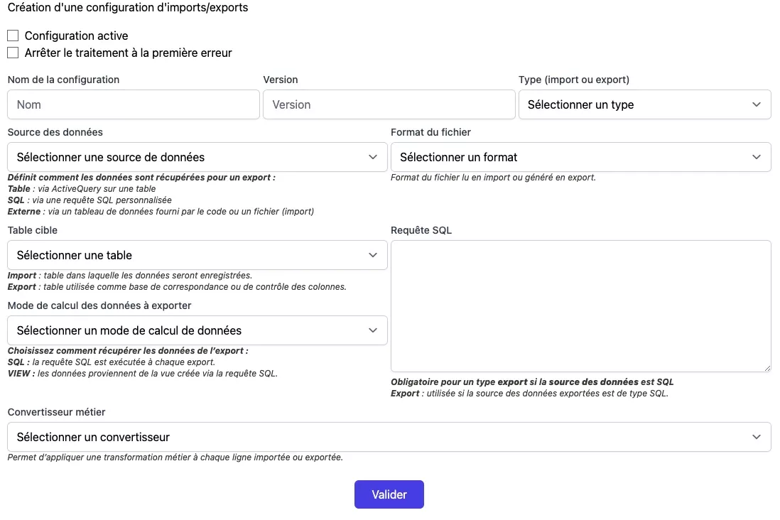 - type : Configuration pour un import ou un export