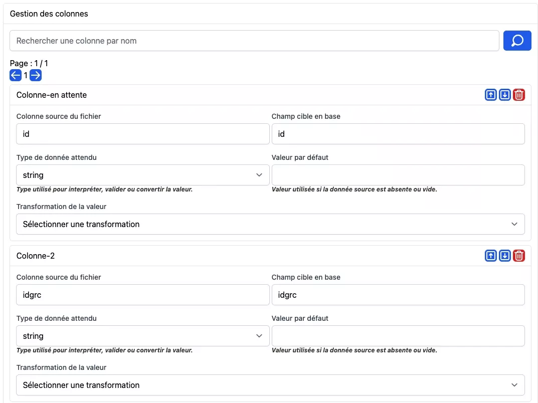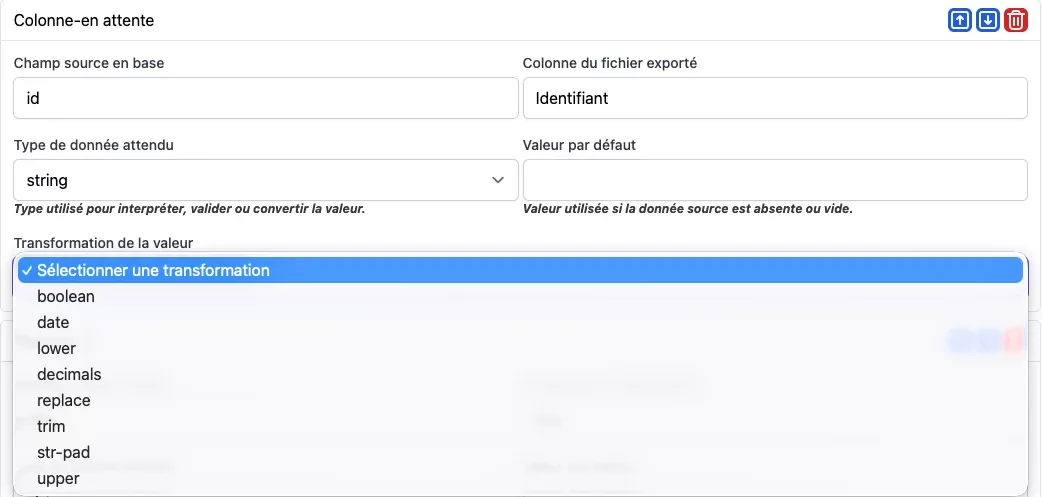 Chaque colonne peuvent-être paramétrées individuellement, les transformeurs peuvent-être utilisés afin de convertir la donnée vers le format voulu pour l'import ou l'export